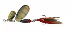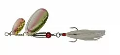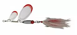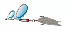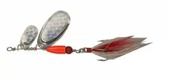 Tandem versie van de BUCK PIKE met 2 lepels van het type “vingernagel”. Zorgt voor zeer complexe trillingen en provoceert aanbeten van snoeken die aan standaardaas geen interesse meer hebben. De bucktail teaser aan de dreg bevat tinsel flash draden en dat is een garantie dat de BUCK PIKE niet over het hoofd wordt gezien. Met een doorzichtig rood oog als doel voor de aanvaller. 1,2mm rvs draad.