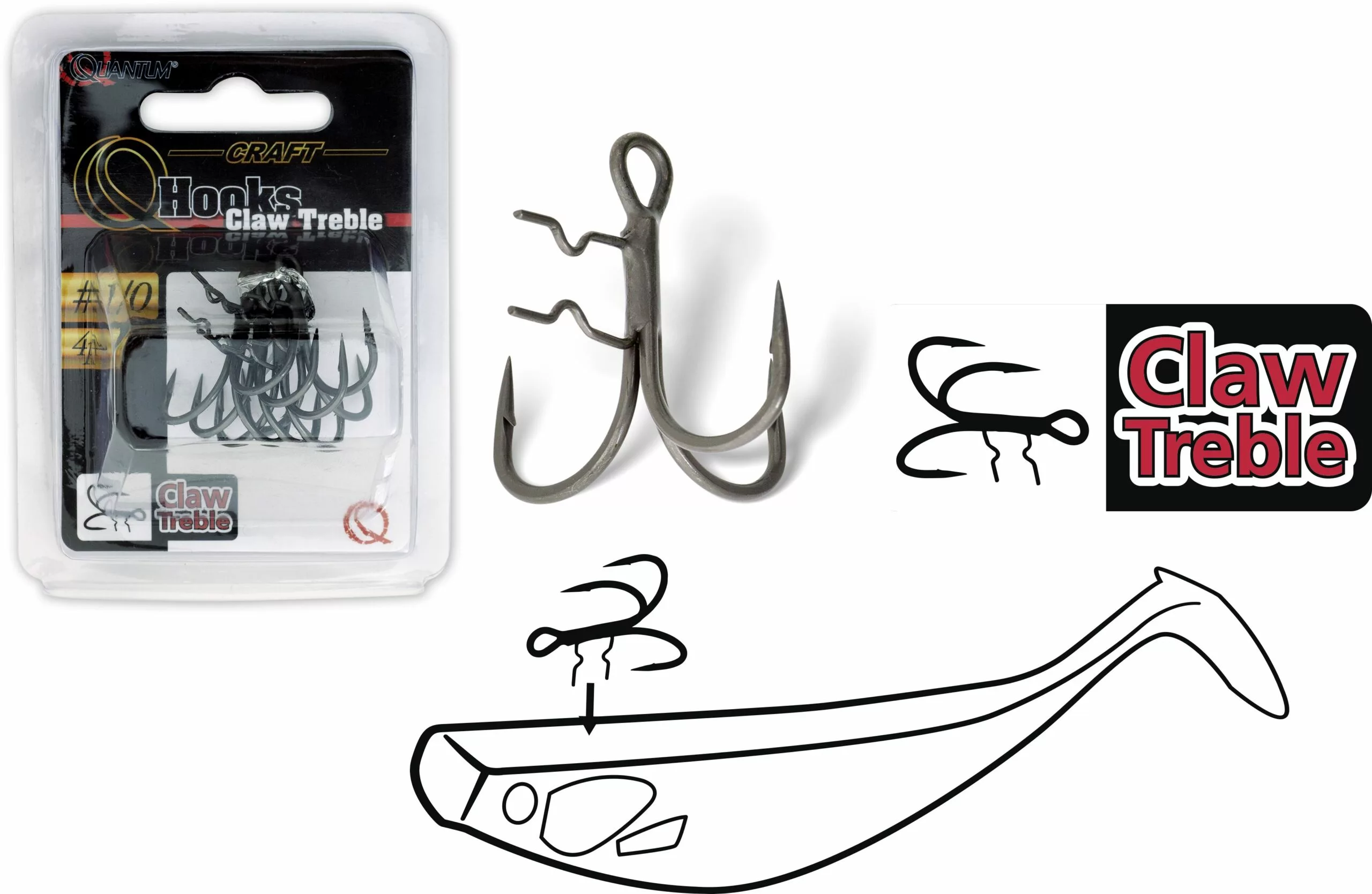 In ons Q-Hook assortiment is een zeer bijzondere haak te vinden, de eerste en enige dreg met een aashouder! Deze speciale ‘Claw Treble’ is zo gevormd dat ze met haar ‘klauw’ zeer eenvoudig op elk punt in de shad vastgezet kan worden, zonder deze te beschadigen of de actie te beïnvloeden. En het bijzondere hiervan is dat alle drie de haakpunten vrij liggen om in te dringen! Los verpakt en verkrijgbaar in acht haakmaten van 6 tot 4/0.