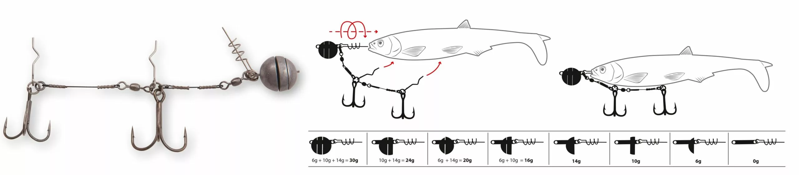 Het nieuwe Yolo Shad Systeem is dé oplossing voor sportvissers die al hun shads met één montage willen kunnen monteren, ongeachte de diepte waarop ze vissen. Het loodje is in drie delen onderverdeeld, waardoor de visser met acht verschillende gewichten aan de slag kan – en dus ook op acht verschillende dieptes en snelheden qua stroming. Het enige wat hij of zij moet doen, is deze delen aanpassen. Uitgevoerd met twee ultrascherpe haken van carbonstaal, waardoor deze montage de vis stevig haakt. Kan snel en gemakkelijk gecombineerd worden met tal van shads.