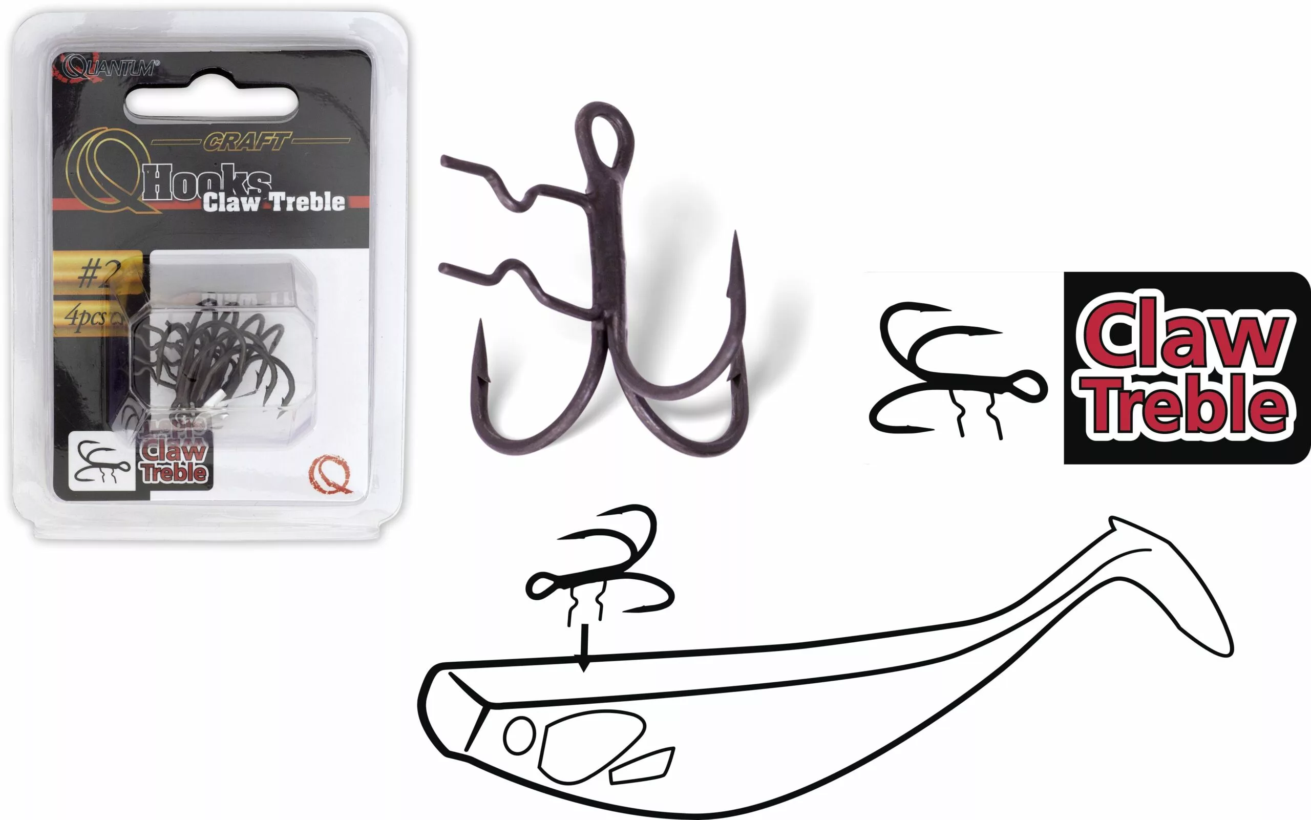 In ons Q-Hook assortiment is een zeer bijzondere haak te vinden, de eerste en enige dreg met een aashouder! Deze speciale ‘Claw Treble’ is zo gevormd dat ze met haar ‘klauw’ zeer eenvoudig op elk punt in de shad vastgezet kan worden, zonder deze te beschadigen of de actie te beïnvloeden. En het bijzondere hiervan is dat alle drie de haakpunten vrij liggen om in te dringen! Los verpakt en verkrijgbaar in acht haakmaten van 6 tot 4/0.