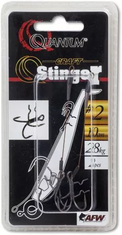 Wanneer een vis een softbait pakt, dan heeft de vis het kunstaas niet altijd geheel in de bek. Wanneer het moeilijk is om goede aanbeten te krijgen, dan kan een extra dregje uitkomst bieden! De nieuwe Q-Stingers maken dat jij weer een grotere kans maakt om in die gevallen vis te haken. Dankzij de unieke Q-dreg met een klauw aan de zijkant van de haaksteel, kunnen alle drie de haakpunten nu langs de softbait gepositioneerd worden. Je hoeft geen haakpunten meer in de softbait te steken, je kunt nu met alle drie de haakpunten de vis haken! Geproduceerd volgens de hoogste kwaliteit in de belangrijkste shadlengtes en met AFW roestvrij staaldraad met een trekkracht van 28 kg en AFW sleeves. Een handig detail is de stugge rubber tube boven de lus waarmee de stinger bevestigd wordt, de stinger kan nu aangebracht worden aan de jighaak of aan het haakoog.