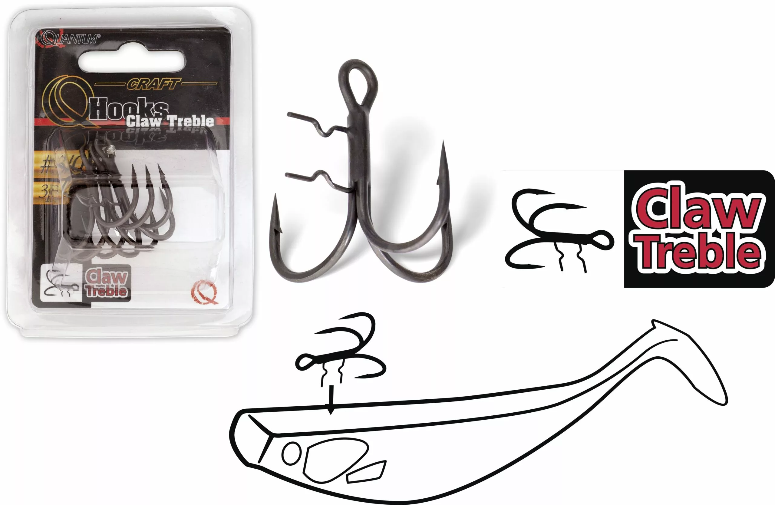 In ons Q-Hook assortiment is een zeer bijzondere haak te vinden, de eerste en enige dreg met een aashouder! Deze speciale ‘Claw Treble’ is zo gevormd dat ze met haar ‘klauw’ zeer eenvoudig op elk punt in de shad vastgezet kan worden, zonder deze te beschadigen of de actie te beïnvloeden. En het bijzondere hiervan is dat alle drie de haakpunten vrij liggen om in te dringen! Los verpakt en verkrijgbaar in acht haakmaten van 6 tot 4/0.