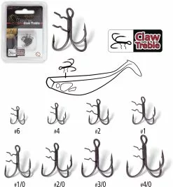 In ons Q-Hook assortiment is een zeer bijzondere haak te vinden, de eerste en enige dreg met een aashouder! Deze speciale ‘Claw Treble’ is zo gevormd dat ze met haar ‘klauw’ zeer eenvoudig op elk punt in de shad vastgezet kan worden, zonder deze te beschadigen of de actie te beïnvloeden. En het bijzondere hiervan is dat alle drie de haakpunten vrij liggen om in te dringen! Los verpakt en verkrijgbaar in acht haakmaten van 6 tot 4/0.