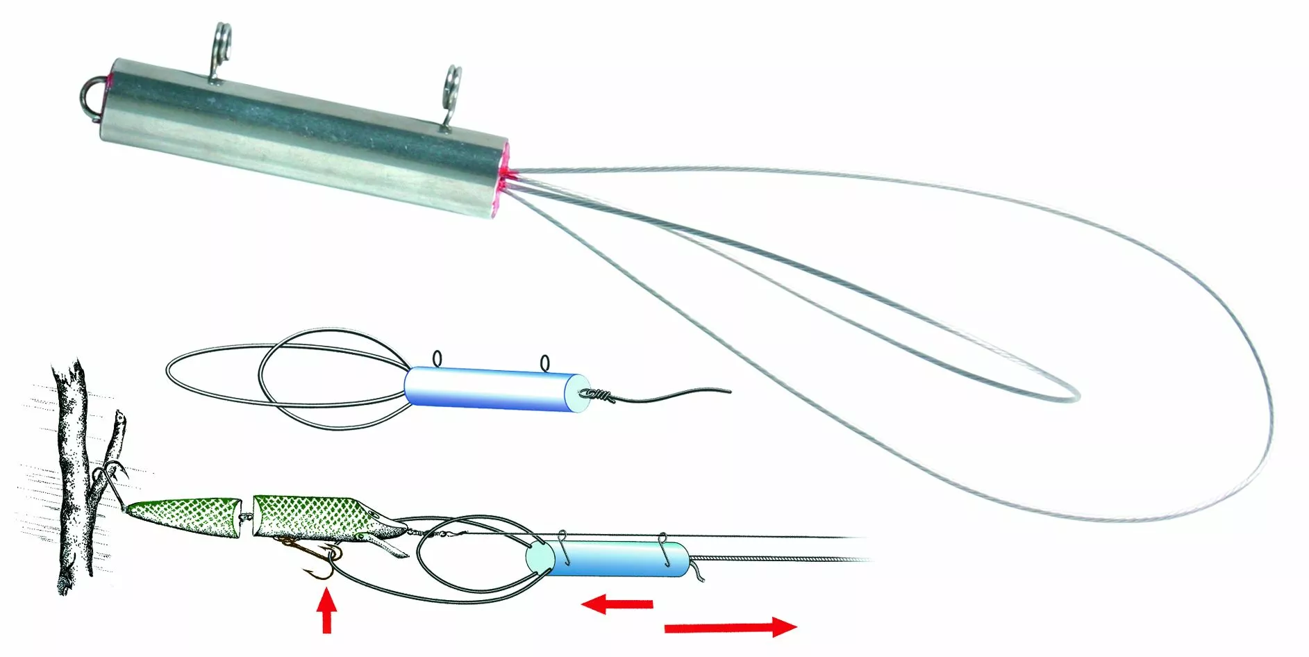 Weer een ontwerp van Peter Biedron, deze kunstaasredder. Als u vastloopt, dan laat u hem langs een strakke lijn naar beneden glijden. Een van de twee zacht RVS-lussen komt rond de plug te zitten, waardoor u uw kunstaas weer kunt lostrekken.