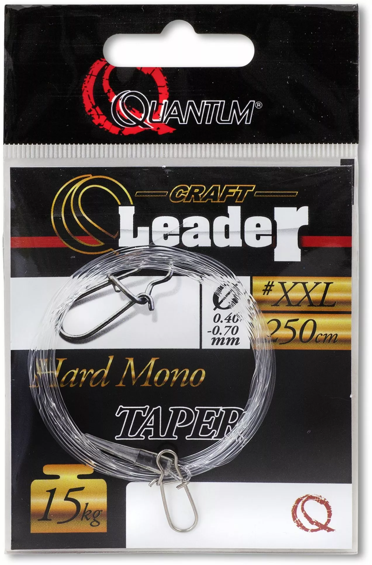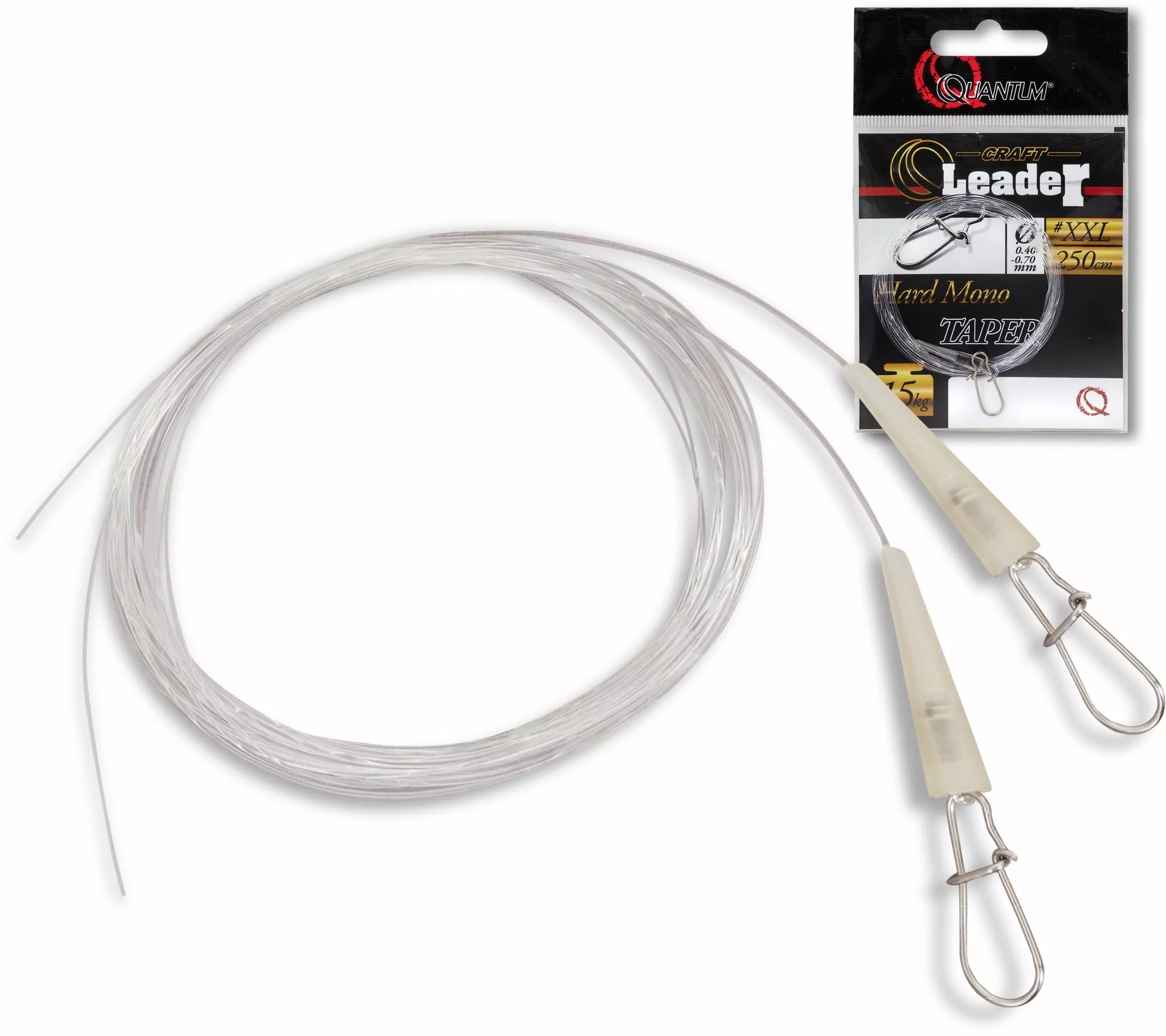 Vervaardigd van een nylonpolymeer, is het oppervlak van het hard monofilament onderlijnmateriaal zeer duurzaam zonder stijf te zijn. Een uniek kenmerk van de leader is het getaperde ontwerp! Dit maakt het mogelijk om het dunne uiteinde direct aan de gevlochten lijn te knopen, waardoor een geleidelijke overgang ontstaat en je optimale werpkwaliteiten hebt. Het dikke uiteinde van de onderlijn, dat voorzien is van een Q-Snap, zorgt voor de noodzakelijke bescherming in de buurt van het kunstaas! Ergonomisch ontworpen, transparante beschermsleeves boven de Q-Snap beschermen de onderlijn tegen irritante waterplantdelen. Geschikt voor zowel zoetwater als zoutwater.