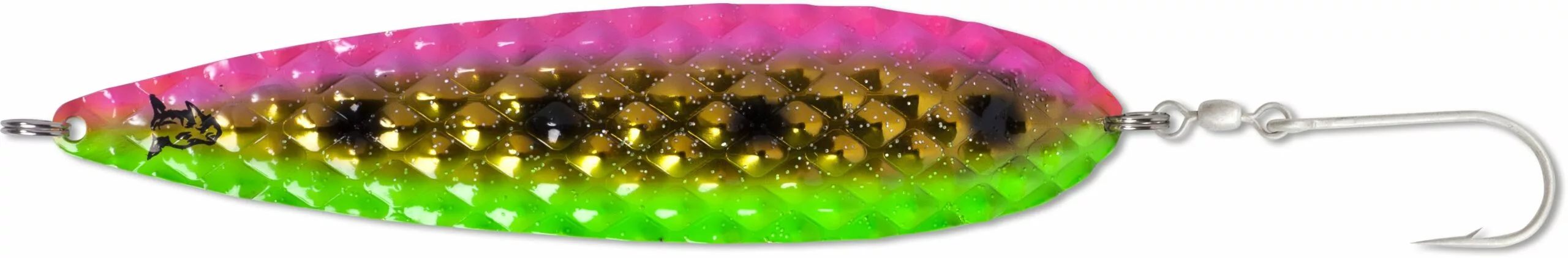 Deze lepel combineert het succesvolle watermeloen-patroon met neonkleuren. In de combinatie met koper opvallend maar toch ook decent tegelijk. Goed voor het oppervalk en de middelste waterlagen.