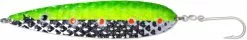 Klassieke kleurencombinatie van neon geel/groen, daarbij komt er veel zilver te voorschijn, wat voor sterke lichtreflexen zorgt. Al bij weinig zonlicht speelt dit kunstaas haar sterke troeven uit, ze kan het best ingezet worden vanaf het wateroppervlak tot op een diepte van 20 meter.