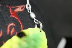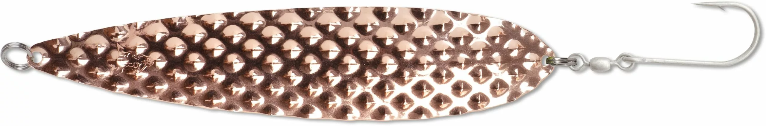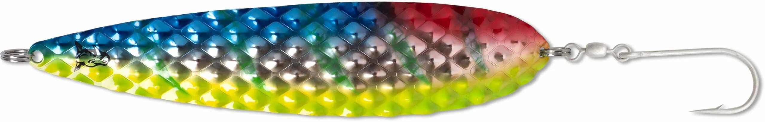 Beproefd patroon met de Zweeds vlag en wat extra’s. De rode vlek toont de zalm waar hij de lepel kan pakken bij een aanval. In de praktijk functioneert het!