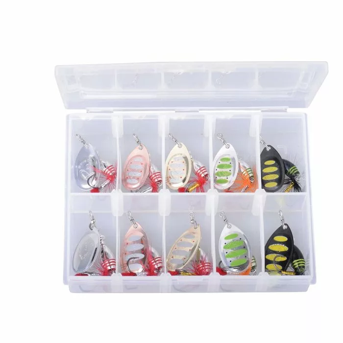 Deze 10 delige set met Rotex Spinners van Savage Gear wordt geleverd in een tacklebox waarin je ze netjes kunt opbergen.