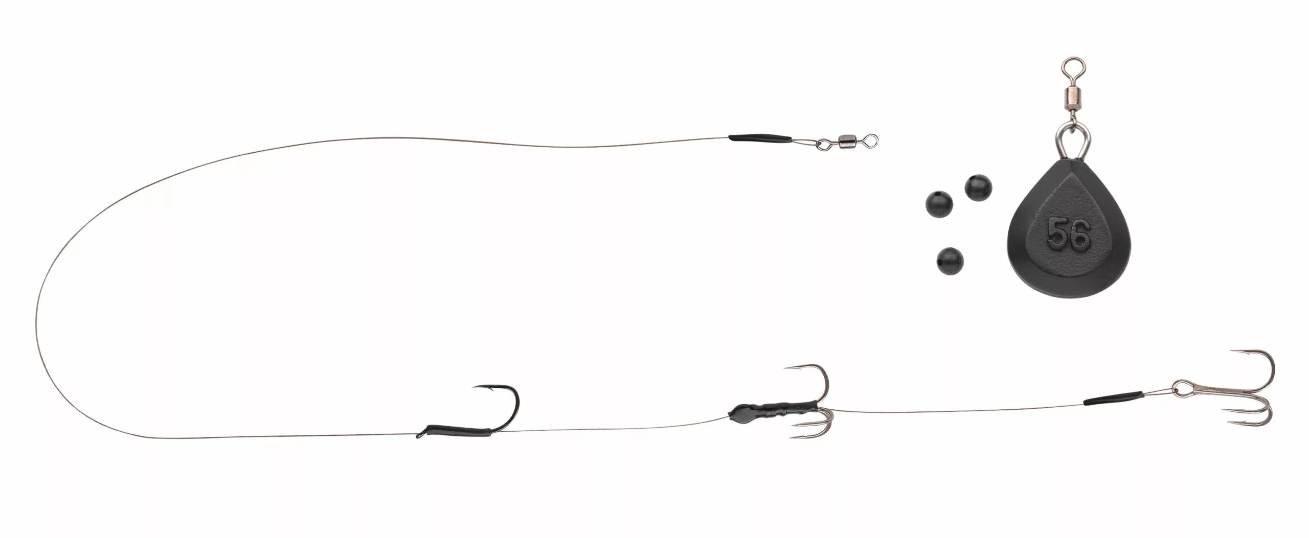 Een complete dood-aas bodem rig voor het snoekvissen in de koudere periodes. De rig is gemaakt met de beste componenten zoals, RVS 49 strand American Fishing Wire en Gamakatsu dreggen. De rig komt standaard met een gecoat 56 gram gewicht en 3 rubberen kralen. Met deze kant en klare rig ben je altijd “ready to go”!