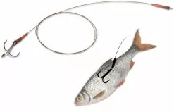 Float Rig Leader – kant-en-klare montages voor het dobber vissen met een dode aasvis, gemaakt met haken van carbonstaal die aan onze onopvallende staaldraad met een trekkracht van 30 lb (14 kg) zijn bevestigd. Om een hoge kwaliteit te garanderen is elke sleeve met de hand dichtgeknepen én gecheckt op treksterkte.